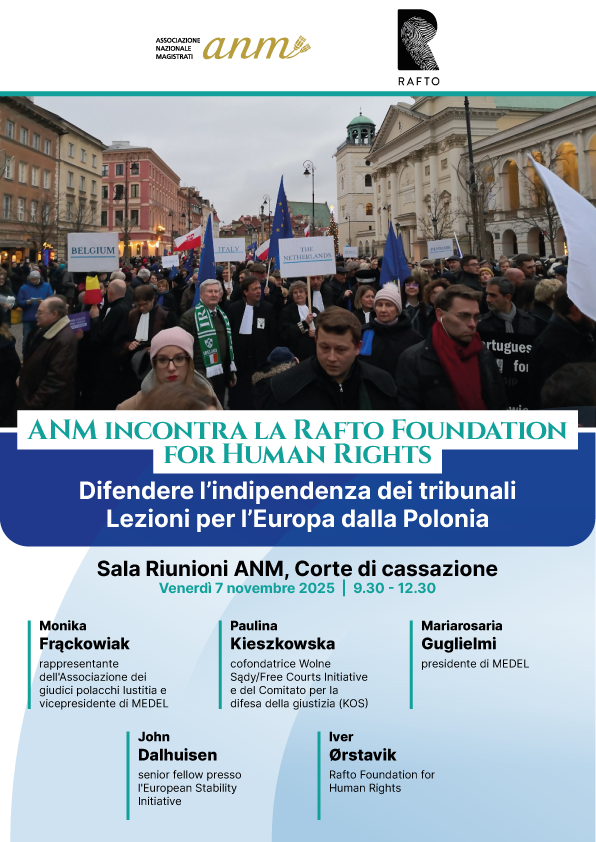 Un incontro sul tema dell'indipendenza della magistratura. L'Associazione nazionale magistrati ospita la Rafto Foundation for Human Rights per un confronto che parte dall'esperienza della Polonia. Si svolgerà venerdì 7 novembre nella sede dell'Anm in Corte di cassazione.